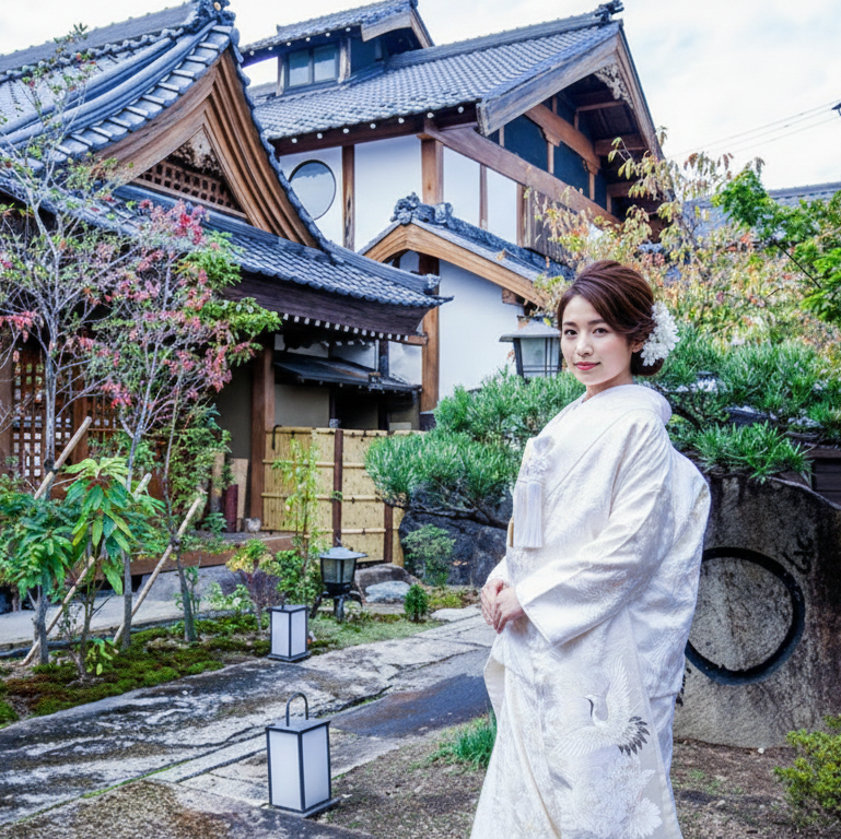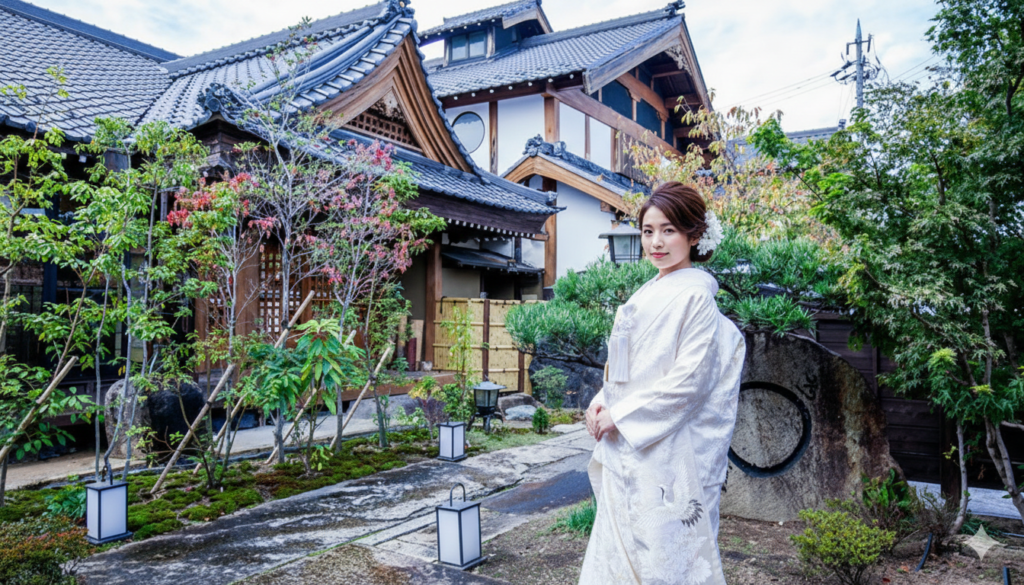 約120年前に福井県今庄町で建てられた旧家を知立市に移築しました。入口の門は約250年前の姿をそのまま残し、二人の門出の出発点となります。